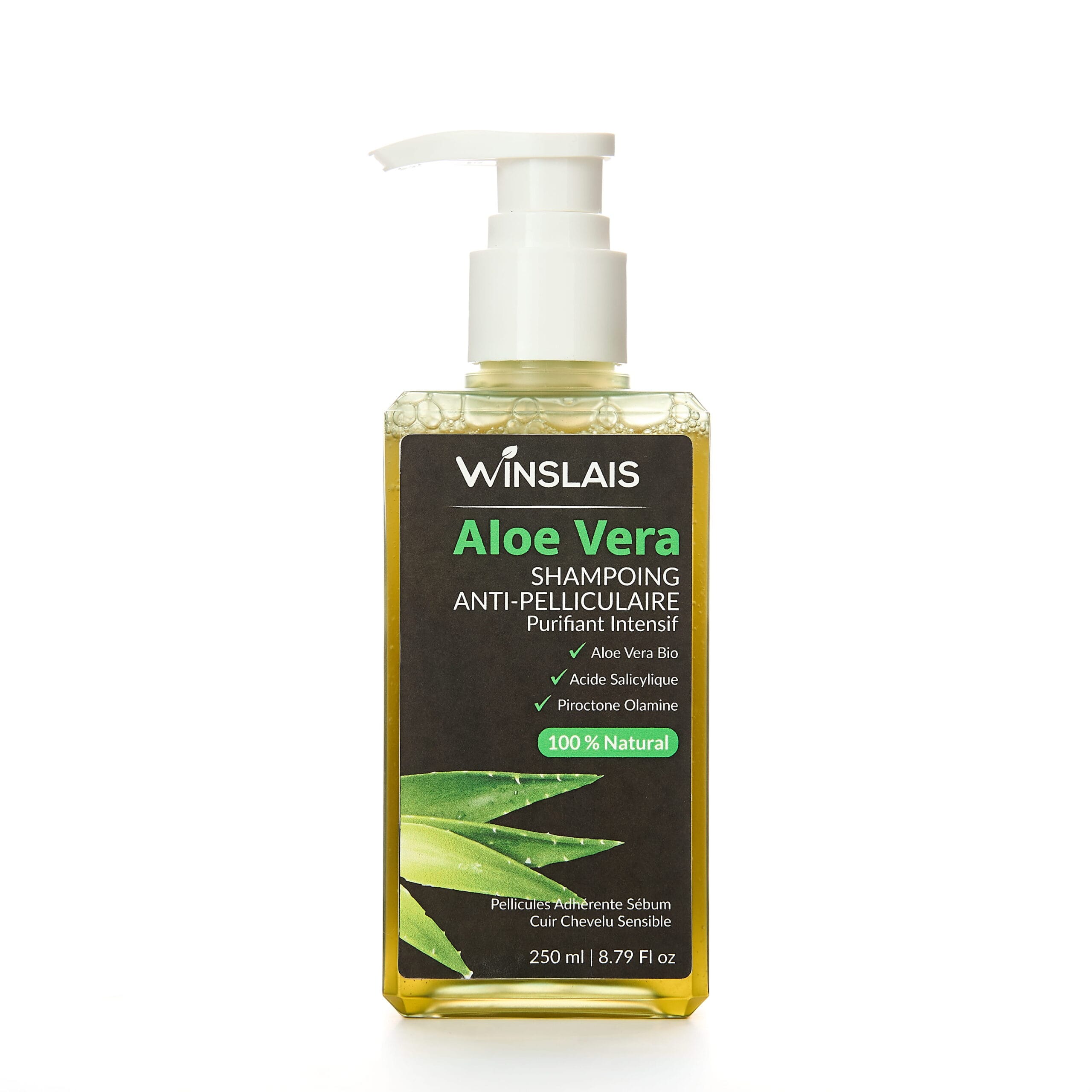 Shampooing Anti-Pelliculaire Purifiant Intensif WINSLAIS à l’Aloe Vera, à l’acide salicylique et à la piroctone olamine. Élimine les pellicules, régule l’excès de sébum et apaise le cuir chevelu sensible tout en laissant les cheveux frais et brillants.